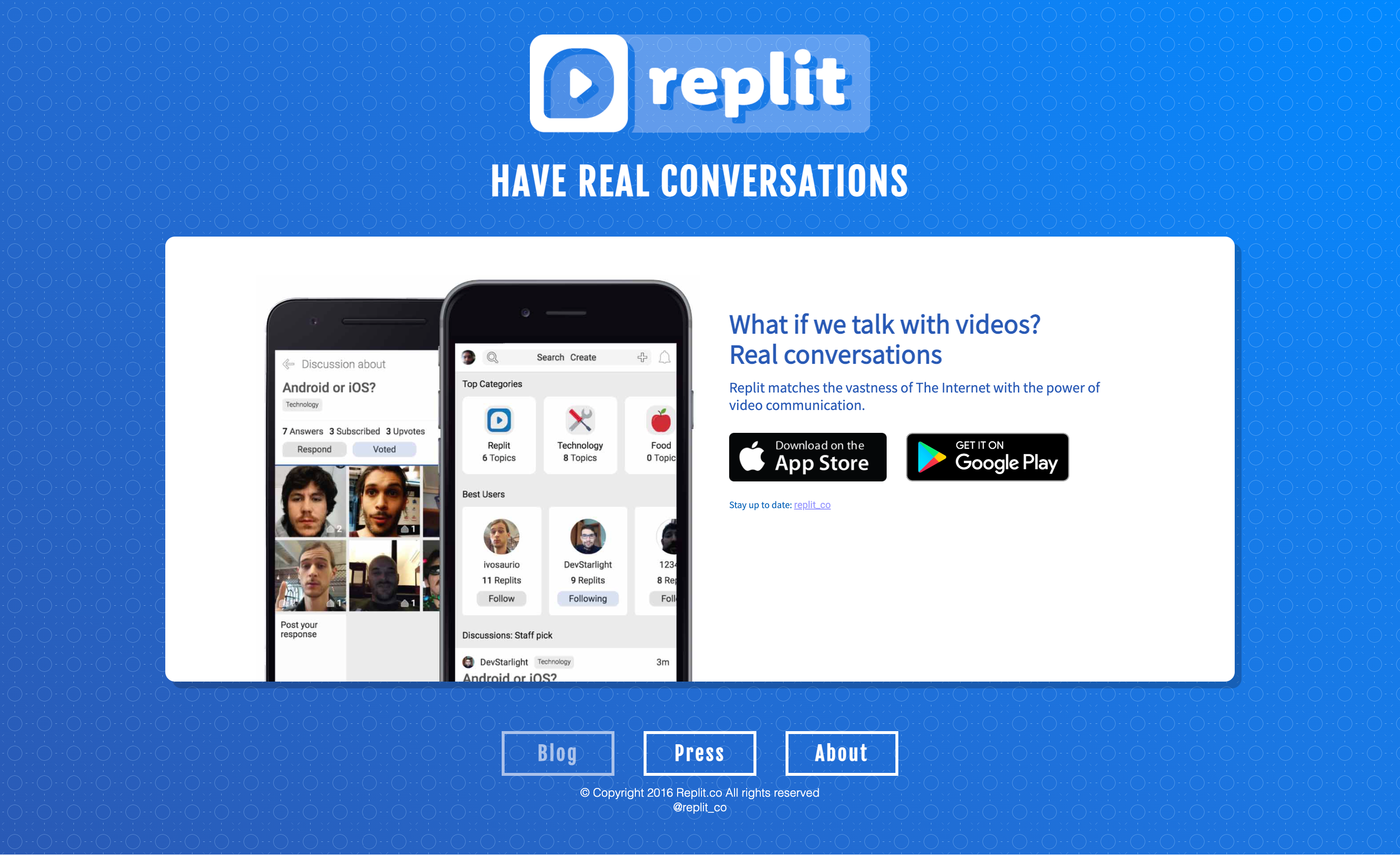 Replit offered both a web and mobile experience that allowed users to engage in short, public, and private video conversations structured similarly to a forum. Users could navigate through a mixture of threads and conversations based on the topics they followed.